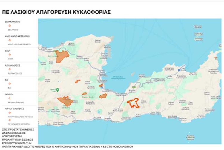 Με την υπ’αριθμ. 180436/ 27-05-2024 απόφαση του Αντιπεριφερειάρχη Λασιθίου εφαρμόζουμε το μέτρο της προληπτικής απαγόρευσης διέλευσης, παραμονής και κυκλοφορίας προσώπων και οχημάτων, σε περιοχές NATURA, καθώς και σε δασικά οικοσυστήματα, πάρκα και άλση, όπως ορίζονται στις διατάξεις του Ν.998/1979 (Α ́ 289) της Π.Ε Λασιθίου, για τις ημέρες εκείνες της αντιπυρικής περιόδου 2024  που ο «Χάρτης Πρόβλεψης Κινδύνου Πυρκαγιάς» της Γενικής Γραμματείας Πολιτικής Προστασίας  είναι κατηγορίας 4 (πολύ υψηλή) ή κατηγορίας 5 (κατάσταση συναγερμού), ως κάτωθι: