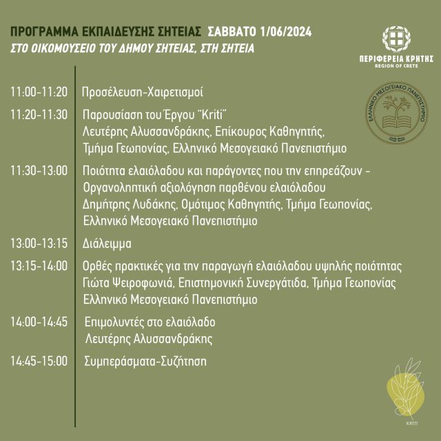 Η Περιφέρεια Κρήτης και το Ελληνικό Μεσογειακό Πανεπιστήμιο, σε συνεργασία με το Δήμο Σητείας, διοργανώνουν ημερίδα με θέμα την ποιότητα του Εξαιρετικού Παρθένου Ελαιόλαδου “Kriti”, η οποία θα πραγματοποιηθεί το Σάββατο 1 Ιουνίου στις 11.00 π.μ., στο “ΟΙΚΟΜΟΥΣΕΙΟ ΤΟΥ ΔΗΜΟΥ ΣΗΤΕΙΑΣ” (πρώην ΚΕΓΕ).