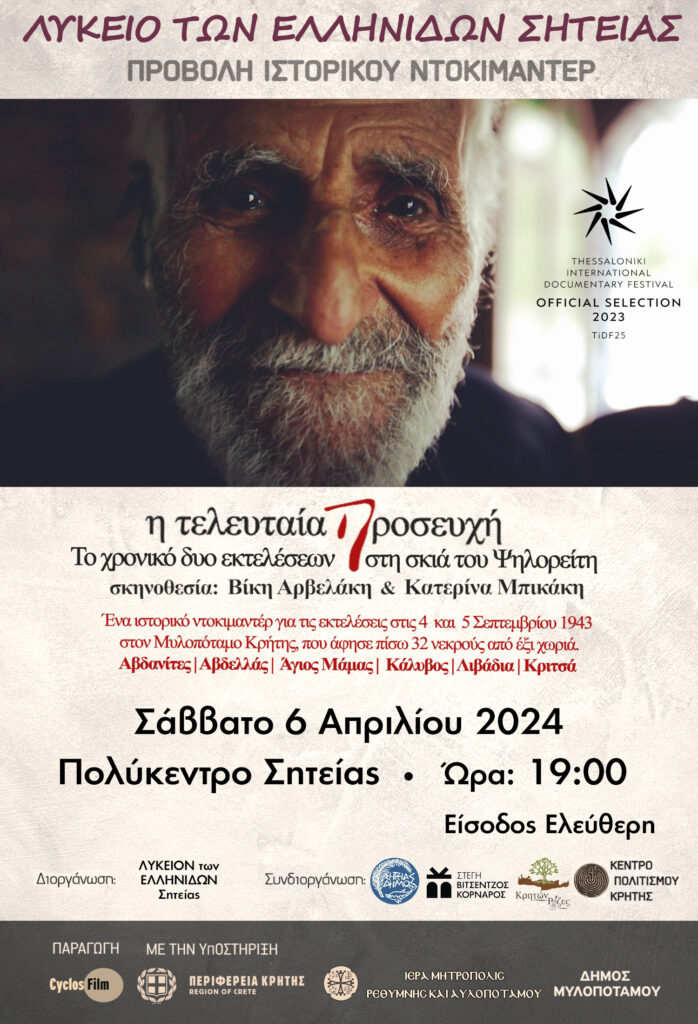 Το Λύκειο Ελληνίδων Σητείας διοργανώνει το Σάββατο 6 Απριλίου 2024 στις 7.00, στο Πολύκεντρο Δήμου Σητείας, την προβολή του ιστορικού ντοκιμαντέρ “Η τελευταία προσευχή”, σε σενάριο – σκηνοθεσία Βίκης Αρβελάκη & Κατερίνας Μπικάκη.
