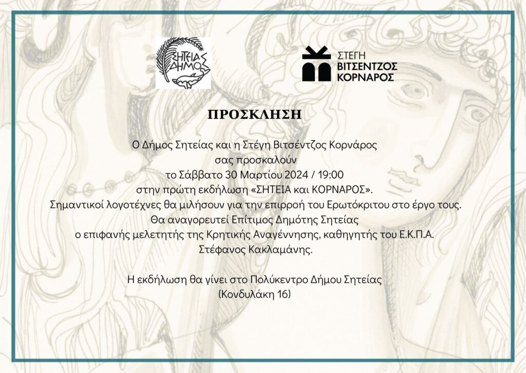 Στις 30 Μαρτίου 2024, στις 19.00, στον χώρο του Πολύκεντρου, η Σητεία θα τιμήσει τον Βιτσέντζο Κορνάρο σε μια λαμπρή τελετή, που συνδιοργανώνουν ο Δήμος Σητείας και η Στέγη Βιτσέντζος Κορνάρος.