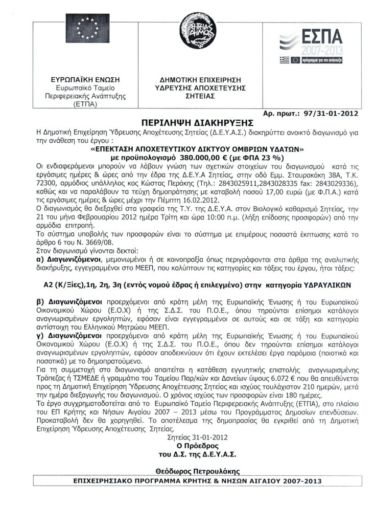 02-02-2012.ΠΕΡΙΛΗΨΗ ΔΙΑΚΗΡΥΞΗΣ ΑΝΟΙΚΤΟΥ ΔΙΑΓΩΝΙΣΜΟΥ ΓΙΑ ΤΗΝ ΑΝΑΘΕΣΗ ΤΟΥ ΕΡΓΟΥ :«ΕΠΕΚΤΑΣΗ ΑΠΟΧΕΤΕΥΤΙΚΟΥ ΔΙΚΤΥΟΥ ΟΜΒΡΙΩΝ ΥΔΑΤΩΝ»