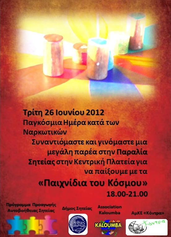 Το Πρόγραμμα Προαγωγής Αυτοβοήθειας Σητείας την Τρίτη 26 Ιουνίου 2012 , την Παγκόσμια Ημέρα Κατά των Ναρκωτικών, θα βρίσκεται με τα «Παιχνίδια του Κόσμου» στην Παραλία Σητείας στο ύψος της Κεντρικής Πλατείας από τις 18.00 έως τις 21.00 . Συντιόμαστε μικροί και μεγάλοι και γινόμαστε μια μεγάλη παρέα για να παίξουμε με τα «Παιχνίδια του Κόσμου».
