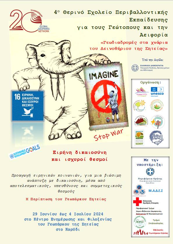 Σε μια περίοδο που ο πλανήτης μαστίζεται από συρράξεις, θνησιμότητα και κάθε μορφή βίας και λαμβάνοντας υπόψη την κλιματική κρίση ως αποτέλεσμα ανθρώπινων επιλογών και ανθρωπογενών καταστροφών, το φετινό θερινό σχολείο Εκπαίδευσης για τους Γεω-τόπους και την Αειφορία στο Γεωπάρκο Σητείας έχει αναφορά στο 16ο Στόχο της Αειφορίας, που είναι αφιερωμένος στην προαγωγή ειρηνικών, και χωρίς αποκλεισμούς, κοινωνιών που θα παρέχουν ισότιμη πρόσβαση στη δικαιοσύνη καθώς και αποτελεσματικούς και υπεύθυνους θεσμούς σε όλα τα επίπεδα.